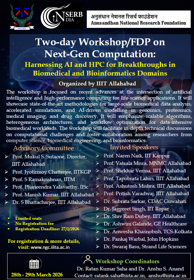 Department of Applied Sciences and Department of Information Technology are jointly organizing a Two-day workshop/FDP on "Next-Gen Computation: Harnessing AI and HPC for Breakthroughs in Biomedical and Bioinformatics Domains" from 28-29th March, 2026. The workshop is focused on recent advances at the intersection of artificial intelligence and high-performance computing for life-science applications. ...More