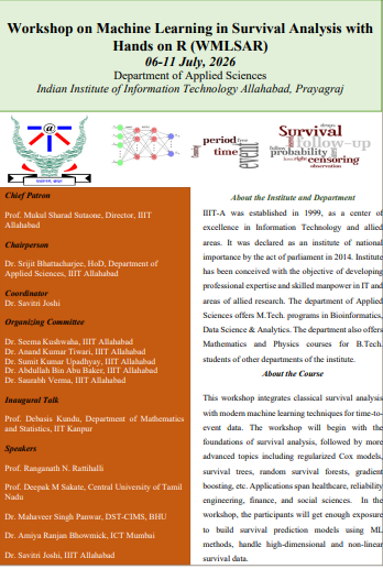 The Department of Applied Sciences, Indian Institute of Information Technology Allahabad (IIIT-A) is going to organise a workshop on Machine Learning in Survival Analysis with Hands-on R during July 06-11, 2026. ...More